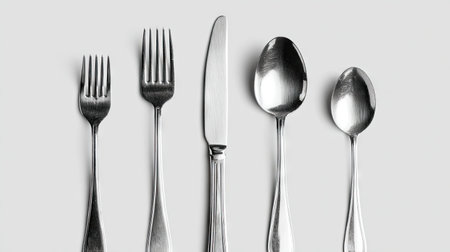 This image showcases a refined arrangement of various silverware including forks, a knife, and spoons on a subtle gray background, highlighting elegance.