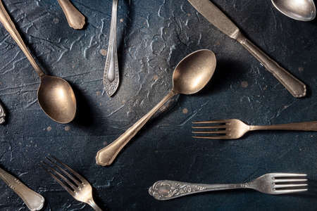 rustic vintage cutlery set, including a knife, spoon, and fork, arranged on a black background, captured from a top view perspective