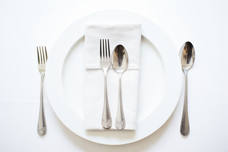 Table setting with white plates, and cutlery - fork, spoon and knife. Shot from above. Copy space on empty plate.