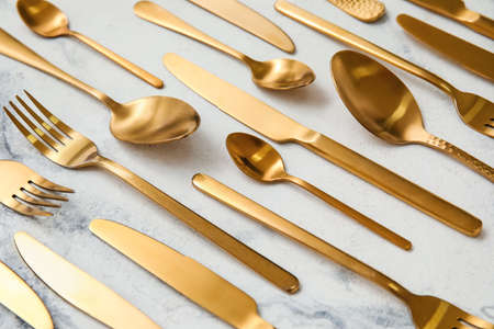 Several knives and forks in black gold and silver on a dark concrete background. Preparing the table for lunch
