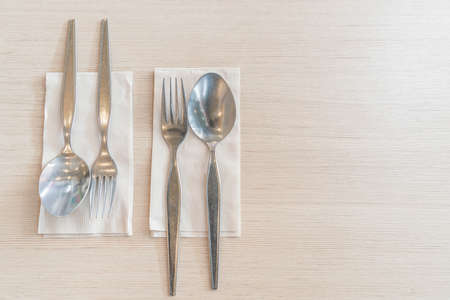 Top view of utencil spoon fork and knife wrapped with fabric on the table.