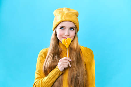 Portrait of a cute girl with a heart shaped lollipop. Sends blows a kiss while looking at the camera, Sexy female lips. Separate on a blue background.