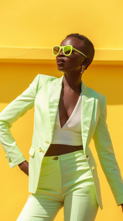 A black woman confidently posing in a stylish green suit and sunglasses.
