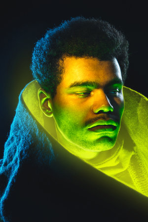 Young mans portrait isolated on blue studio background in multicolored neon light with geometric luminescent shape cirlce