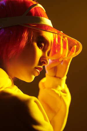Girl in smart yellow glasses. virtual reality glasses. Atmospheric fashion photos