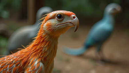 A close-up shot of a vibrant orange bird with a sharp beak, set against a blurred background where two other birds are walking. The bird's unique plumage and curious expression capture the essence of exotic wildlife in its natural habitat.
