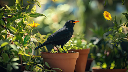 A black bird with a striking orange beak stands on a terracotta pot filled with lush greenery. Bright yellow flowers and various plants create a vibrant and serene garden atmosphere.