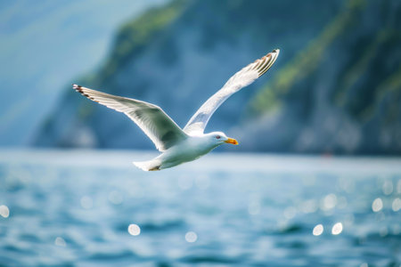 A white bird is gracefully soaring over a vast body of glistening water. The birds wings are outstretched as it glides effortlessly through the air, creating a striking contrast against the blue waters below.