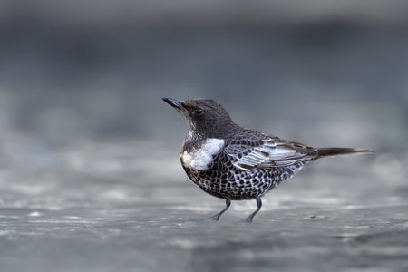 Adult ring ouzel (Turdus torquatus) shot close up sitting on the ground in different types of background