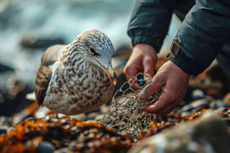 A close-up shot of a person's hands gently freeing a seagull from a fishing net, emphasizing the bird's detailed feathers and beak.