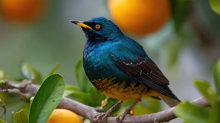 A colorful bird with iridescent blue and yellow plumage rests on a tree branch. The image highlights the bird's feathers against a backdrop of green leaves and orange fruit. The scene is illuminated by natural light, evoking a sense of tranquility. Suitable for nature-themed projects or editorial content.