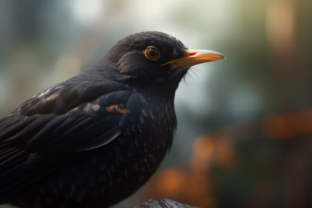 Detailed close-up of a common blackbird, highlighting its sharp beak and glossy black plumage