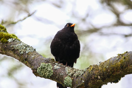 Male blackbird with a bright orange beak perching on a tree branch in a spring forest