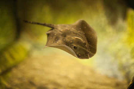 Stingray motoro, Potamotrygon motoro in an aquarium on sandy bottom. Freshwater river spotted brown stingray peacock lying in aquarium pool, close up. Wild animal, zoology, aquatic creature