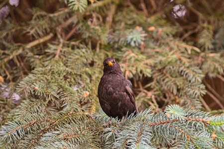 thrush black sits on a branch in a tree crown