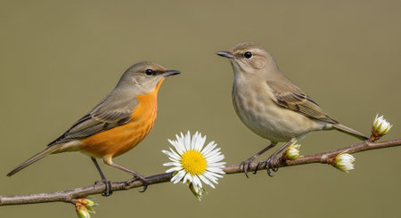 Two songbirds perched delicately on a flowering branch in nature