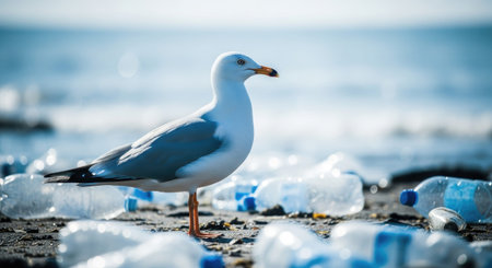 Seagull on the beach with plastic bottles in the background.