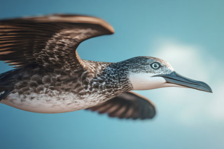 Seabird in dynamic flight, soaring with wings spread against a clear blue sky, showing freedom and movement