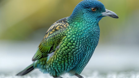 A close-up of a blue bird with green and yellow feathers.