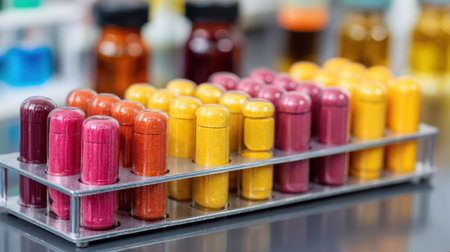 Multivitamin tablets are arranged neatly in a metal tray, surrounded by colorful laboratory equipment in a bright setting.