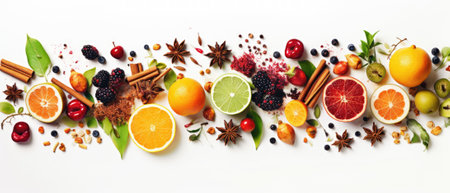 A vibrant assortment of fruits, herbs, and spices displayed in warm, moody lighting. The rich colors and varied textures create a dynamic and appetizing scene, perfect for food, culinary, and health-related content.