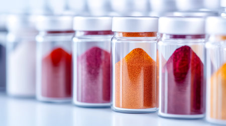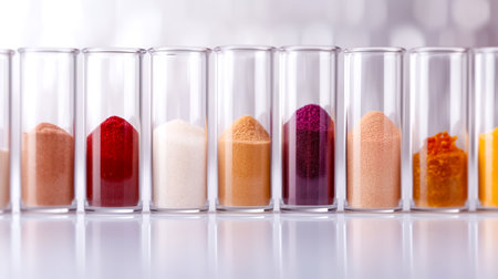 A series of glass tubes contain various colorful powders, showcasing a beautiful spectrum of reds, yellows, browns, and purples in a well-lit studio environment.