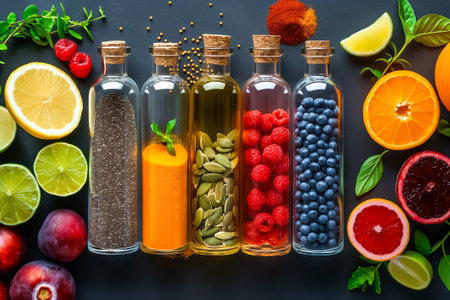 An assortment of vibrant fruits, including citrus and berries, complements several glass bottles filled with natural ingredients and spices on a dark background.