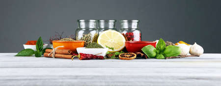 Spices and herbs on table. Food and cuisine ingredients on white table
