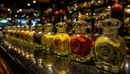 An intimate shot displays the vivid tints and textures of various spices in aged glass containers at a spice bazaar.