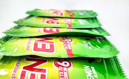 Mount abu, rajasthan, india, september 2019 : Assorted ENO products on white background. ENO is fast-acting effervescent fruit salts, used as an antacid and reliever of bloatedness by company GlaxoSmithKlin