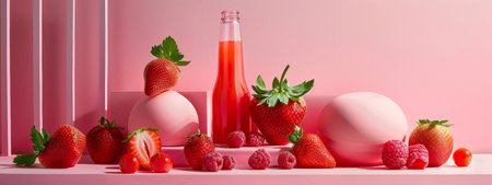 A selection of fresh strawberries and a bottle of raspberry juice beautifully displayed on a pink backdrop, emphasizing the vibrant red hues of the fruit.