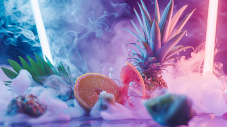 Creative arrangement of tropical fruits including pineapple and citrus, surrounded by vibrant neon lights and mist. The dynamic composition highlights the fresh fruit and creates a dreamy, atmospheric effect.