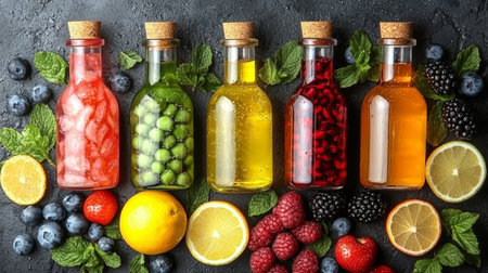 colorful fruit and berry juices in glass bottles generative ai.