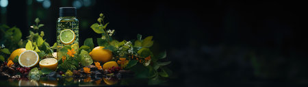 A top view of fresh citrus slices and juices arranged with herbs on a vibrant background. The bright colors and refreshing elements make it perfect for themes related to health, wellness, and summer.