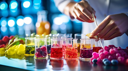 Scientist in food lab measuring with precision colorful backdrop
