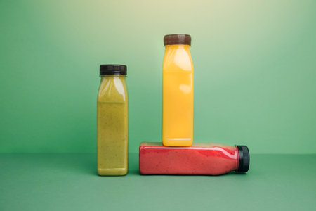 Fruit and vegetable smoothies in transparent plastic bottles. Green, red, orange smoothies on a green background. The concept of healthy eating. Front view