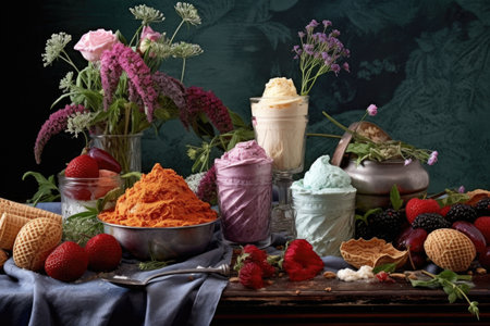 AI Generated. Assortment of various delicious ice cream flavors captured from a top down perspective