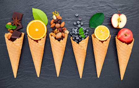 Various of ingredient for ice cream flavor in cones blueberry ,lime ,pistachio ,almond ,orange ,chocolate ,vanilla and coffee set up on dark stone background . Summer and Sweet menu concept.