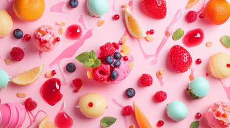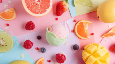 Top view of colorful fruit sorbet served with fresh fruits including oranges, strawberries, and mint leaves. Perfect for summer and dessert themes.
