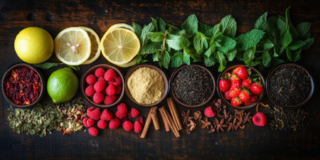 A vibrant assortment of herbal ingredients, including citrus fruits and berries, is artistically arranged on a rustic wooden surface, highlighting diverse colors and textures.