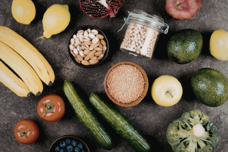 An assortment of fresh fruits, vegetables, and grains arranged on a table.
