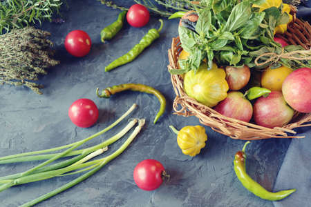 Vegetables and fruits in a basket, spicy herbs, greens on a wooden table, harvest season, organic natural food, healthy food, home cooking