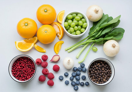 Variety of immunity boosting plant foods on white
