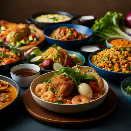 Explore a vibrant spread of dishes captured in a warm inviting restaurant setting.