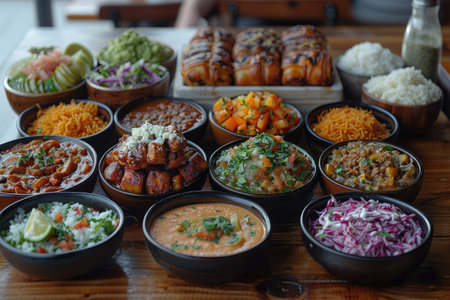 Indian food. Assorted mexican dishes served on wooden board. generative ai
