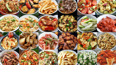 Visually appealing display of different dishes. Ideal for showcasing different cuisines or menu options. Great for social media posts or restaurant marketing materials.