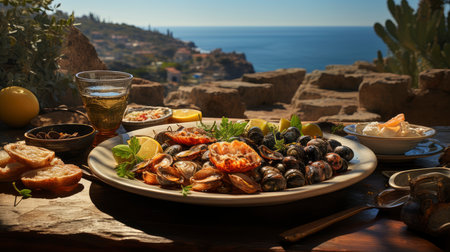 Delicious seafood platter with grilled salmon, shrimp, mussels, and lobster, enjoyed by the sea at sunset