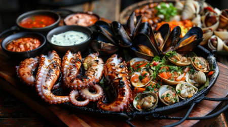 A seafood lover's dream - a tray of grilled squid served with steamed clams, mussels, and a variety of dipping sauces for a decadent feast
