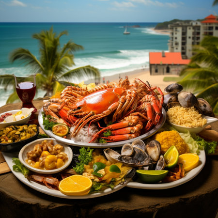 Indulge your senses in the vibrant culinary scene of Salvador, Brazil with this stunning image capturing a colorful platter filled with an array of tantalizing seafood dishes. From mouthwatering moquecas to crispy acaraj