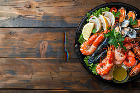 A vibrant seafood platter featuring succulent shrimp, mussels, and flavorful fish. Garnished with fresh herbs and lemon, it enhances any gourmet experience.